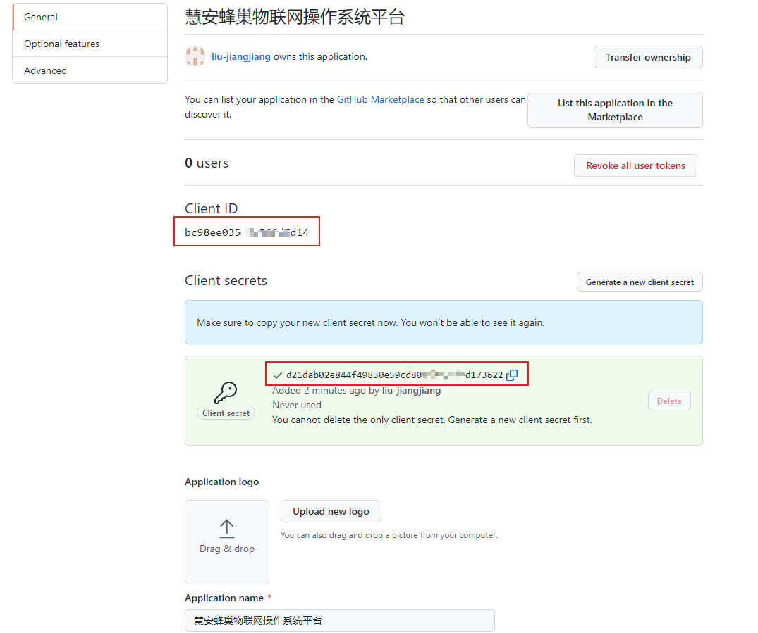 (3)、选择Generate a new client secret 创建密钥,记录ClientId和Client Secrests,保存。