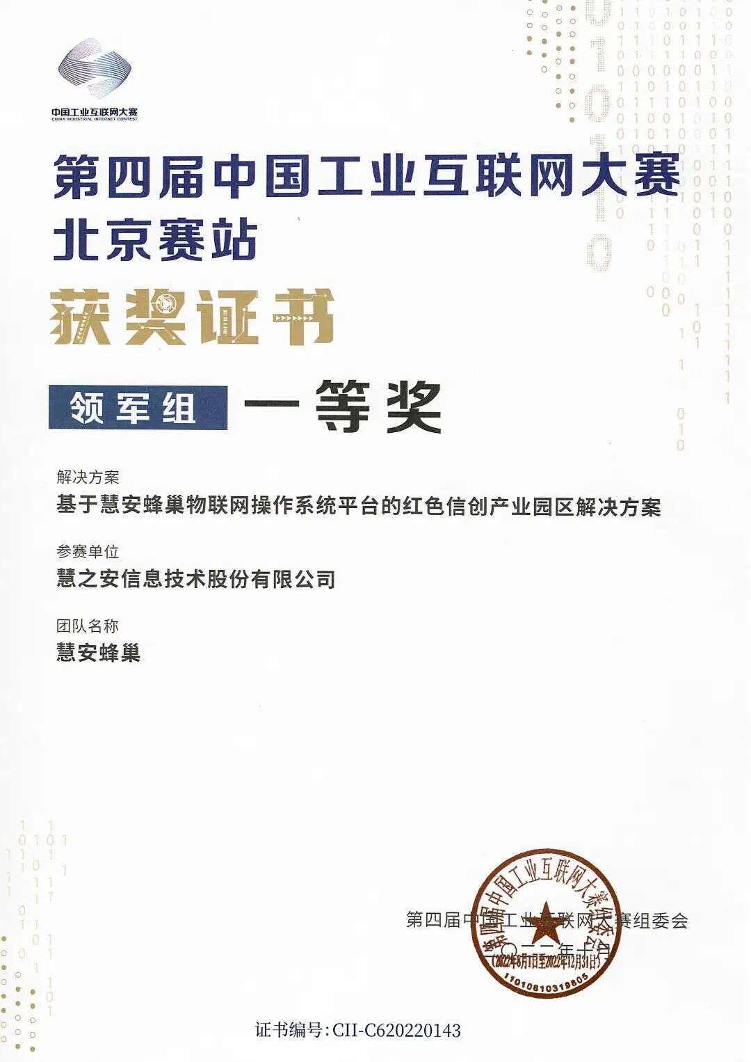 大赛作为国内最高规格的工业互联网领域赛事之一,首次设立北京赛站,赛站由石景山区人民政府、北京市经济和信息化局、北京市工商业联合会、国家工业信息安全发展研究中心主办,石景山区经济和信息化局、中关村软件园公司、中关村工业互联网公司承办,中关村发展集团、北方工业大学特别支持。2022年11月,以“推进产业园区创新应用的解决方案”为赛题方向的北京站决赛于石景山区圆满落幕,慧安股份凭借“基于慧安蜂巢物联网操作系统平台的红色信创产业园区解决方案”获得领军组第一名的优异成绩。