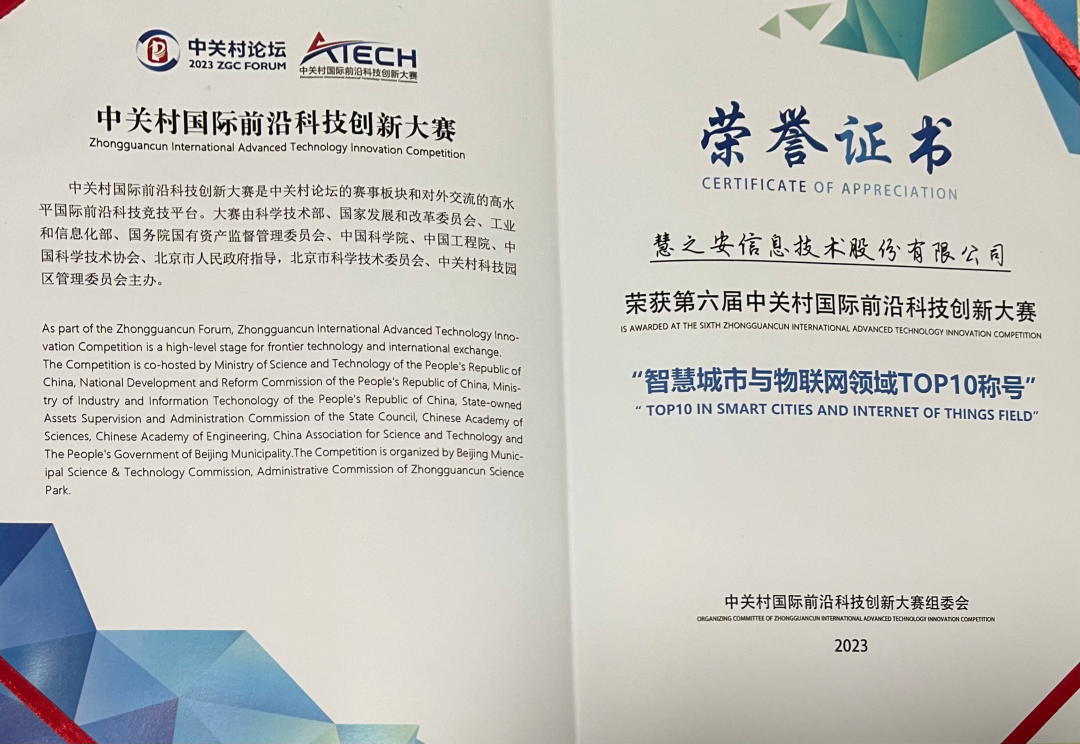 在总决赛颁奖典礼上,慧安股份作为智慧城市与物联网领域领军企业,获得大赛颁发“智慧城市与物联网企业TOP10称号”。