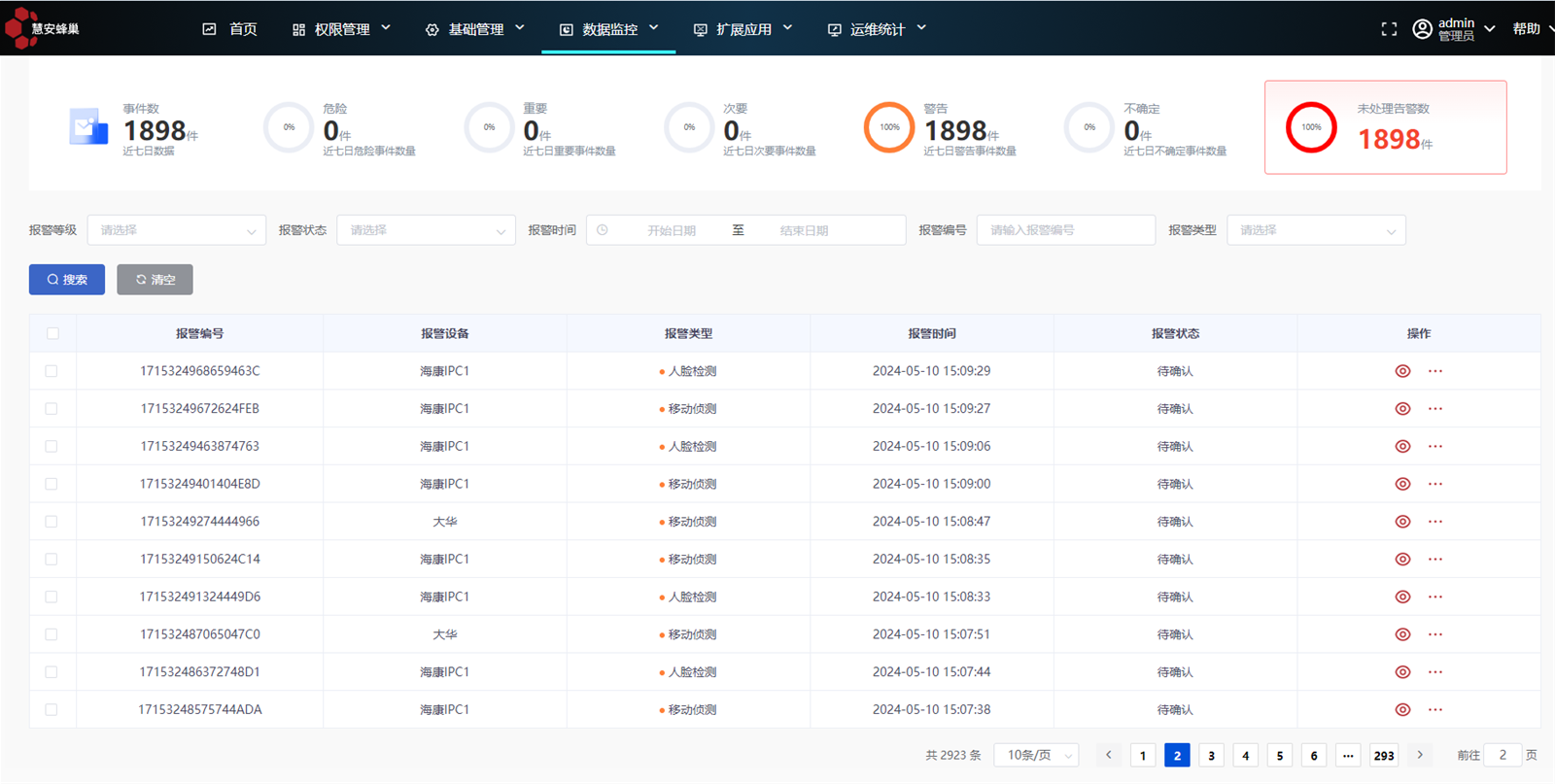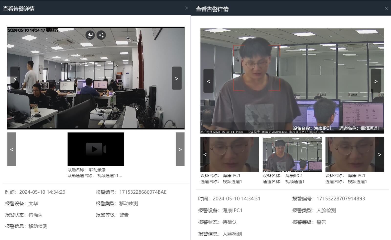 3、多渠道结果展示:报警中心支持Websocket报警推送、RestAPI的报警查询,用户可以通过B/S客户端的历史报警、报警弹窗、大屏滚动或者C/S客户端查看报警,同时也能查看报警的智能分析数据、联动操作结果等内容。