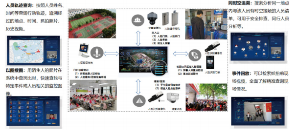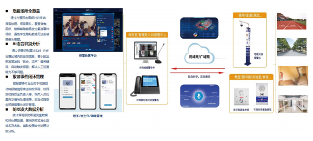 基于物联网、语音识别、大数据等技术,采用可视音视频一键报警终端、报警音柱等设备,部署在学校卫生间、宿舍、教室、楼道、操场等区域,实时 AI 分析设备区域内的音频信息,若识别出“救命、哭声”等敏感词汇时,则现场触发预警语音自动报警干预,同时报警消息可通过手机端、云平台、电脑端等实时通知相关管理人员。