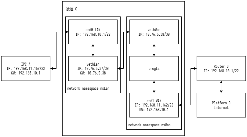 在该方案中,团队创建了两个命名空间:nsLan,负责与IPC端通信;nsWan,负责与上级路由器和平台端通信。两个命名空间之间通过一对虚拟网卡连接,数据通过这对虚拟“网线”安全地转发。IPC发来的数据经过nsLan的DNAT转发,由nsWan接收并处理,然后再原路发往平台。整个过程对IPC与路由器完全透明——它们依旧认为对方直连,毫不知晓中间多了一层智能节点。