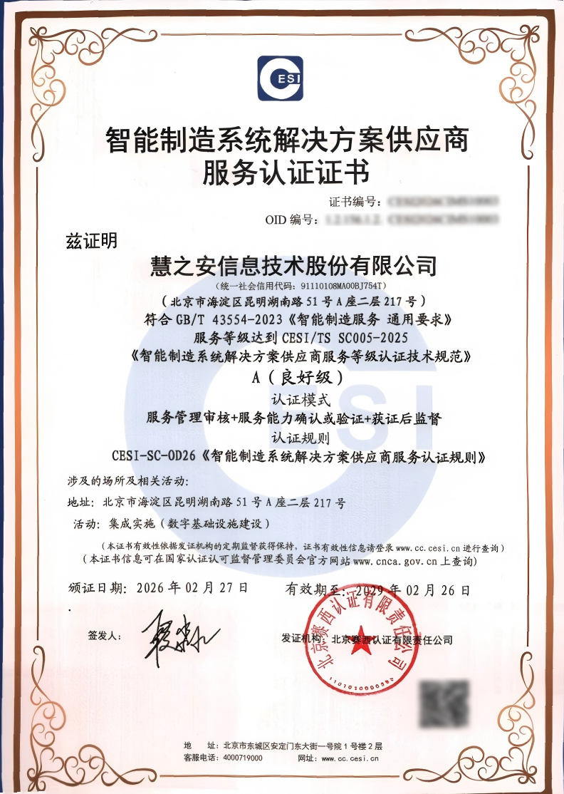 经过严格的材料审核、现场评估与专家评审,慧之安凭借完善的服务体系、丰富的项目实施经验、优质的客户服务品质,成功荣获“智能制造系统解决方案供应商服务A级认证”。这一认证,是国家权威机构对慧之安智能制造解决方案自主研发能力、全流程落地能力、全周期服务能力的三重认可。