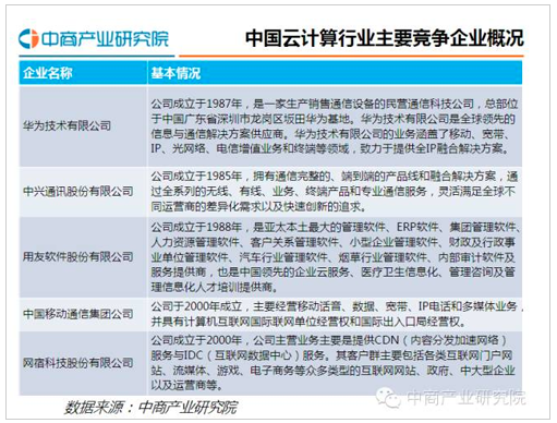 目前,我国云计算行业主要竞争企业有华为技术有限公司、中兴通讯股份有限公司、用友软件股份有限公司、中国移动通信集团公司、网宿科技股份有限公司。