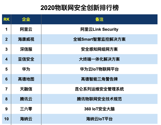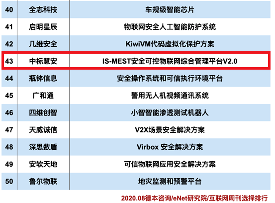 中标慧安荣登2020物联网安全创新排行榜50强