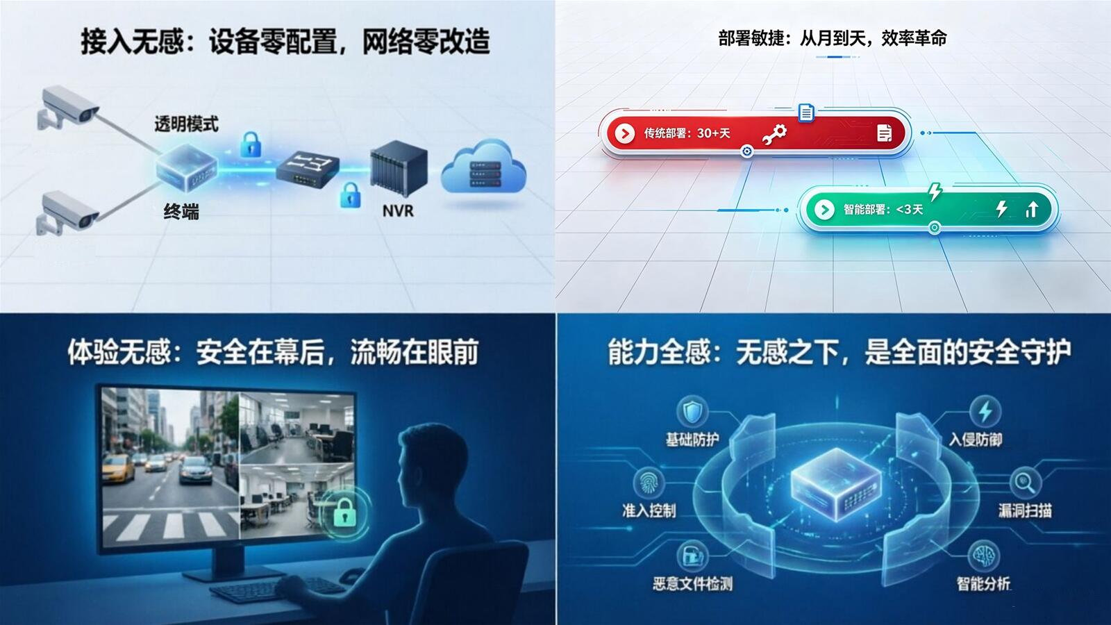 单点位从设备上架到安全能力全开,整个过程可以在几分钟内完成,将传统以月为单位的项目周期,提升至以天为单位的敏捷交付。
