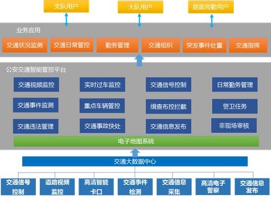 通过统一通信与交互接口层和公安GIS平台,中心平台构建交通集成指挥核心业务模块,包括:视频监控、缉查布控、违法取证、交通信号控制、交通事件检测预警、交通信息发布、电子地图、重点车辆管控、勤务管理、预案管理、非现场审核等。
