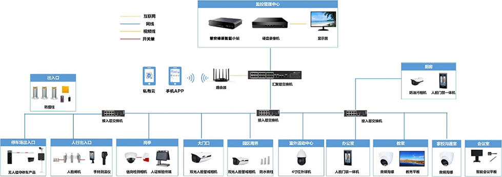 智慧校园解决方案,在园区大门口、园区周界、室外活动场所、教室、后厨等重点区域安装视频监控系统进行全方位可视化监控覆盖,通过安装部署车辆出入口系统,有效管控内外部车辆进出,通过慧安蜂巢智能小站统一实现人车、周界、视频监控等业务管理;在校园大门出入口安装人脸接送系统,实现学校接送信息微信消息推送,实时掌握学生到离园情况;在教室部署视频直播系统,家长通过APP实时查看幼儿在园情况,实现家校互通;教室和会议室部署教育平板和会议平板,有效提高教学质量和会议效率。