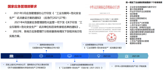2020年10月10日,工业和信息化部、应急管理部联合发布《“工业互联网+安全生产”行动计划(2021-2023年)》,重点任务中指出要打造基于工业互联网的安全生产新型能力,包括建设快速感知能力、实时监测能力、超前预警能力、应急处置能力和系统评估能力。