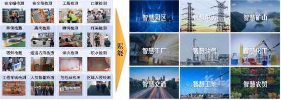 与特定行业领域生产场景紧密结合,为生产现场提供人、物、环境的不安全情况感知能力,针对不同类型行业场景的个性化需求定制化规划算法,根据用户需求定制化开发专用AI算法,形成覆盖常见违章隐患智能识别的行业算法库,满足各类安全生产场景应用需求,应用于众多行业场景,赋能安全生产。