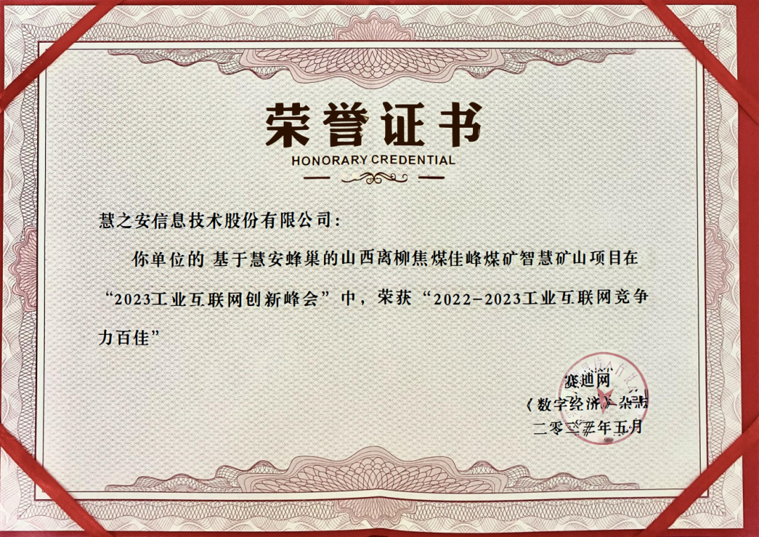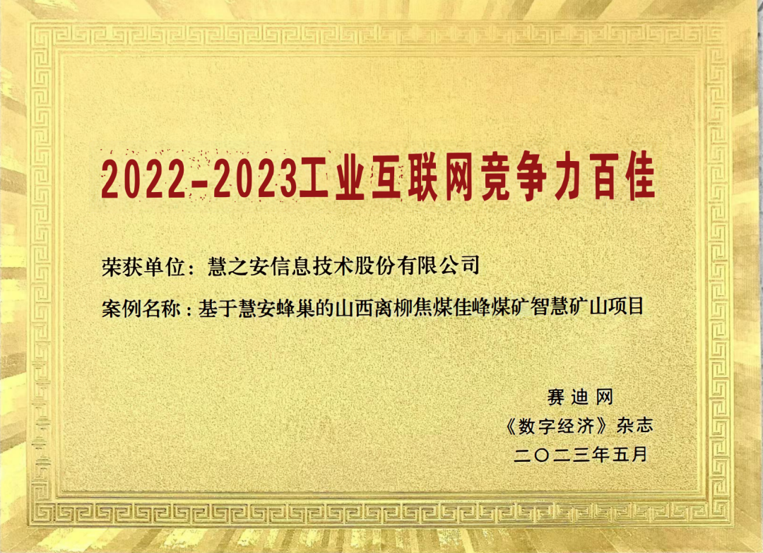 大会发布2022-2023工业互联网竞争力百佳榜单,慧安股份凭借“基于慧安蜂巢的山西离柳焦煤智慧矿山项目”成功入选。
