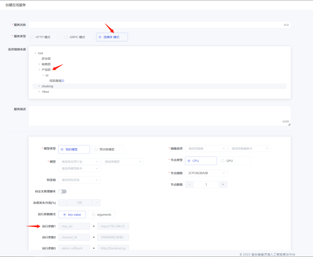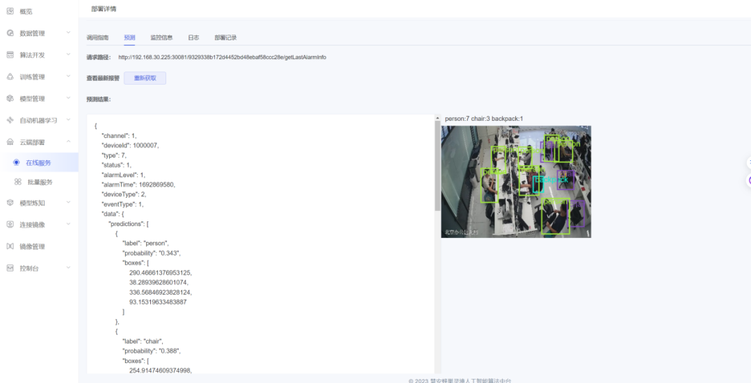 目前,许多AI算法平台都是独立运行的,无法与其他视频管理平台实现联动。为了实现与视频管理平台的无缝衔接,我们在我们的“在线服务”中新增加了“流媒体模式”。当用户选择流媒体模式时,平台会自动检测局域网内的视频管理平台及其视频设备树。通过简单的通道选择,用户即可对所选通道的视频启动实时AI分析。同时,系统也会将可能产生的警报及时显示在AI平台上。