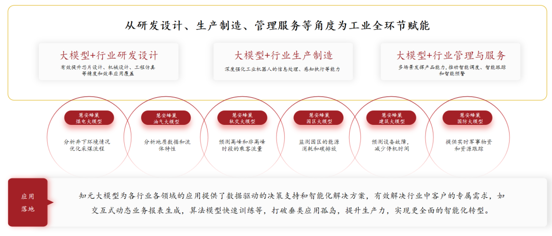 知元有机融合进慧安蜂巢物联网操作系统平台中,结合慧安股份多年和合作伙伴一同积累的行业专有数据,形成了以下行业专有大模型,助力各大行业智能化转型: