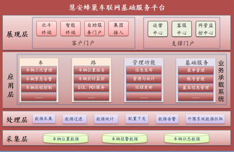 慧安蜂巢车联网服务平台:慧安蜂巢车联网服务平台将每一车辆作为一个信息源,利用汽车行驶记录仪及其它终端通过4G/5G等通信手段连接到网络中,通过收集、处理并共享大量信息,实现车与车、车与路、车与交通网络、车与互联网之间互相联接,实现安全智能管理和服务。
