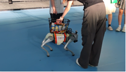 “小安”移动补给犬,配备摄像模组与雷达,可在半径5m内实现人体检测并触发自动驻停,随后以语音交互方式完成自我介绍。除零食与能量补给外,可兼容工业零件配送及展会资料分发等,背部快拆式货箱既可承载零件,也可替换为宣传册托架,实现边行走边精准投送。