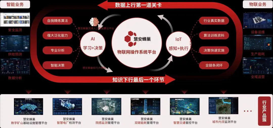 说干就干,余丹带着研发团队开启了“攻坚模式”。不知道熬过多少个深夜,经过无数次调试,他们终于搞出了“大动作”——针对智能物联网市场规模大、需求层次多、应用场景丰富的特点,研制出慧安蜂巢物联网操作系统平台、慧安蜂巢灵境人工智能算法平台、慧安蜂巢知元大模型软件系列产品,作为擘画信创物联网应用生态的红色基座,推动了面向多个行业领域的垂直应用,形成了系列人工智能解决方案。慧安蜂巢系列产品的推广应用,有效促进了人工智能与实体经济深度融合,助力培育壮大AI产业,推动行业数字化转型。