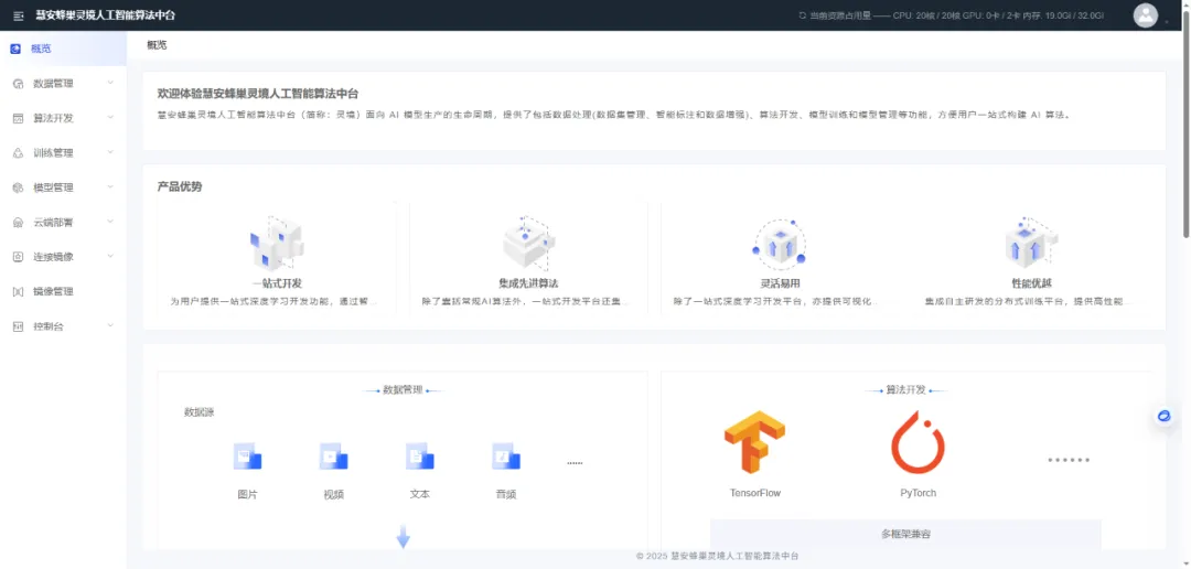 慧安蜂巢灵境人工智能算法平台集算法开发、训练、优化于一体,为算法工程师们提供了一站式的解决方案。如数据挖掘、机器学习、深度学习和自然语言处理等方面的算法和工具,提供从数据采集、标注、清洗到模型训练、部署的一站式AI开发能力,帮助用户解决各种人工智能相关的问题。