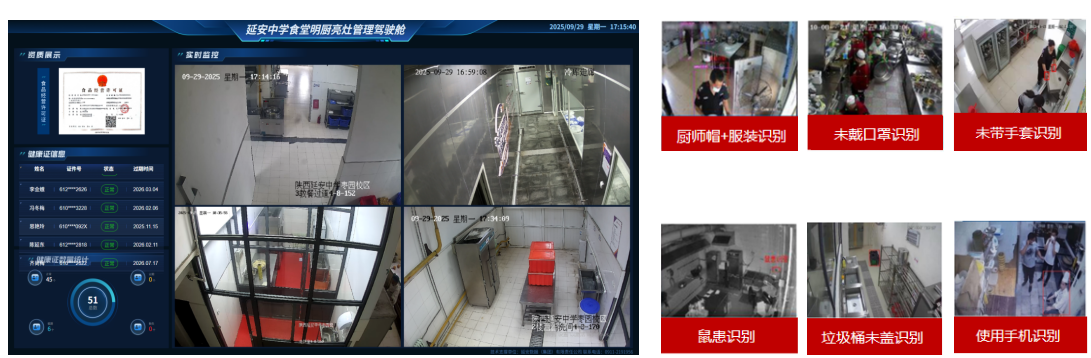 食堂关键区域部署高清摄像头,实时传输画面至学校监管平台、教育部门督查系统;搭载 AI 视频分析算法,自动识别工作人员未佩戴口罩、厨师帽等违规行为,对鼠患、地面油污、食材裸露等环境卫生问题精准捕捉,将 “事后追责” 转为 “事前预警”。