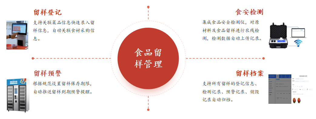 管理人员可使用留样秤实现留样食品的自动称重,支持关联菜品信息快速录入留样信息,自动关联食材采购信息,支持留样容器登记和存储标注,上传留样菜品的实物照片。