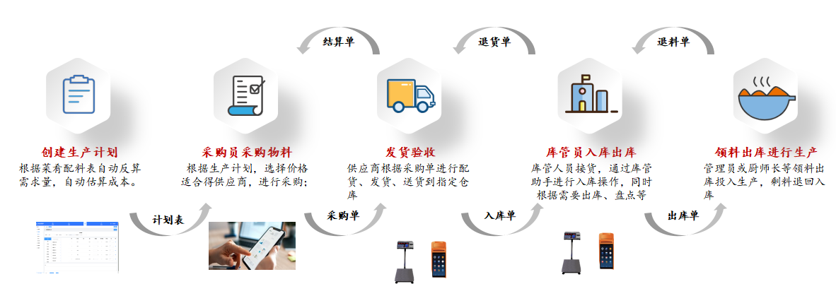 支持线上发起采购申请,跟踪采购订单状态。供应商资质线上存档,进货时扫码录入食材信息,落实政策对食材采购全程追溯的要求;采用智能电子秤及RFID标签,食材入库时自动称重、登记批次,出库时扫码核销,实时更新库存数据,生成进销存台账,避免人工记账误差;系统自动监控食材保质期,临期自动预警,滞销食材提醒优先使用,避免材料浪费,保证食材安全。