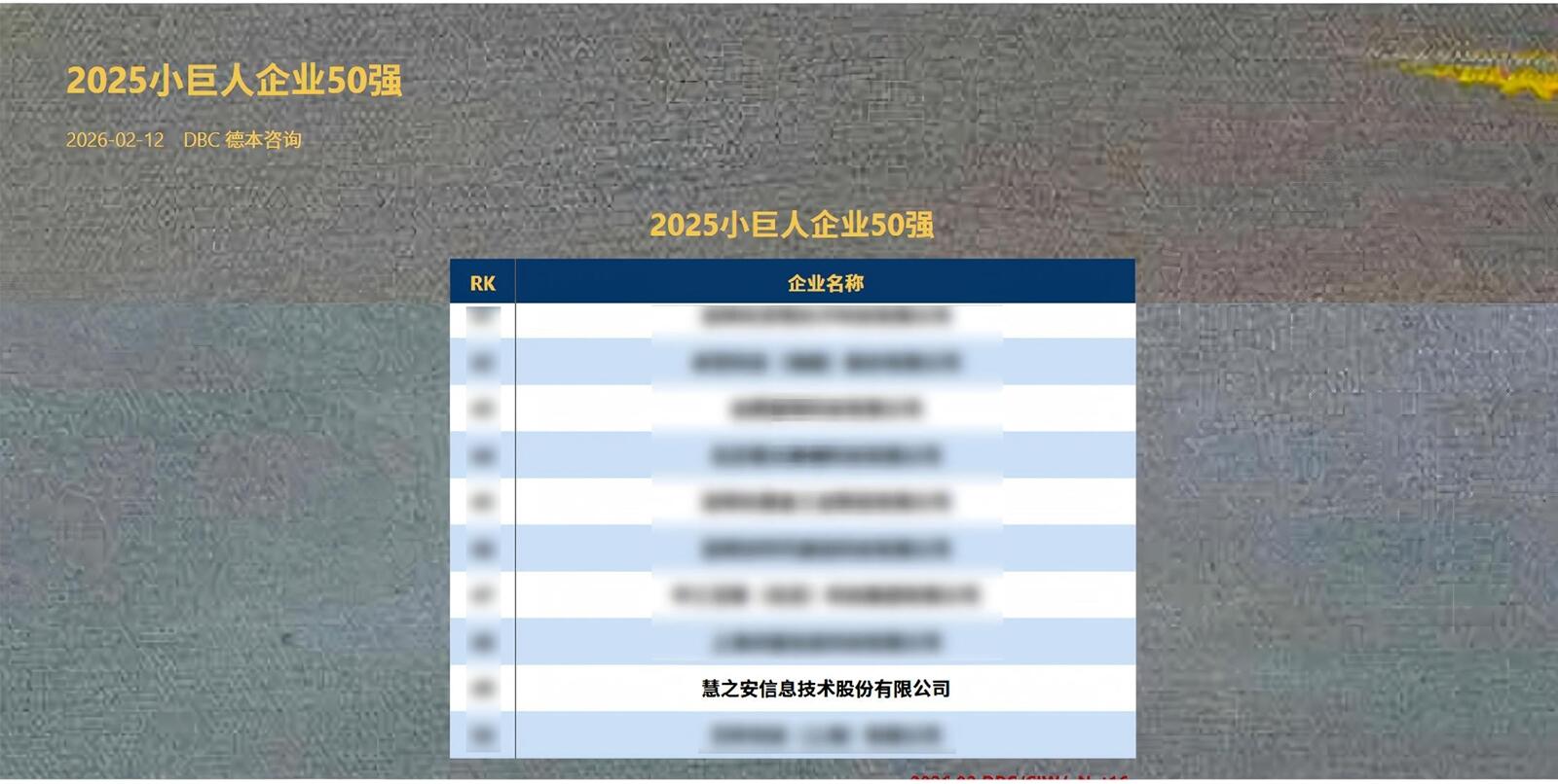 近日,国内知名咨询与评价机构德本咨询发布了备受瞩目的 “2025小巨人企业50强”榜单,慧之安信息技术股份有限公司(以下简称“慧之安”)凭借在专业领域的深厚积累与卓越创新能力,从众多参评企业中脱颖而出,荣耀上榜。
