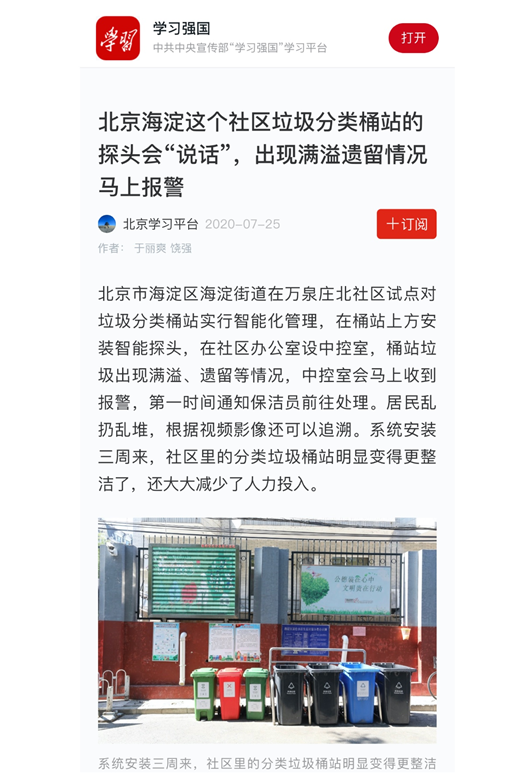 “北京日报客户端”、“学习强国APP”等新闻媒体,均已“这个社区垃圾分类桶站的探头会“说话”,满溢、遗留马上报警”为题,第一时间报道了本次项目的成果。