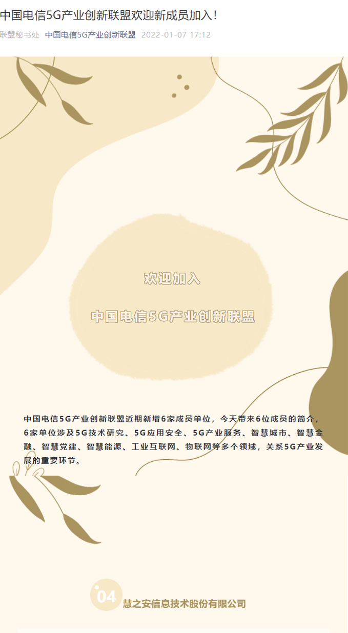 近日中国电信5G产业创新联盟新增6家成员单位,慧安股份位列其中。