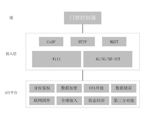 物联网门禁系统架构下,物联网门禁控制器通过MQTT或CoAP、HTTP协议连接至IoT平台,IoT平台为门禁控制器的接入、注册、身份鉴权、OTA固件升级、数据加密、数据存储、状态同步提供全方位支撑。