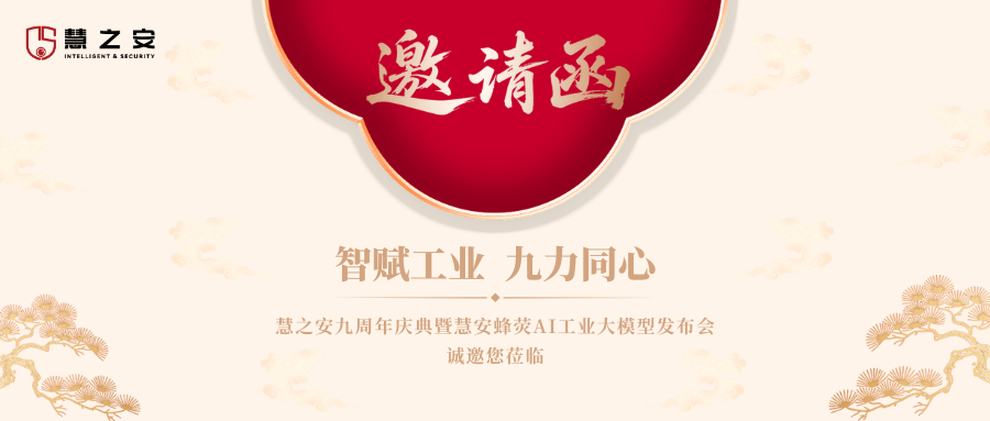 尊敬的合作伙伴、各界朋友: 您好! 智赋工业,九力同心!在慧之安信息技术股份有限公司成立九周年之际,我们诚挚邀请您莅临"慧之安九周年庆典暨慧安蜂荧AI工业大模型发布会",与我们共同回顾成长历程,见证重要时刻,开启智能新篇。自成立以来,慧之安始终专注于工...