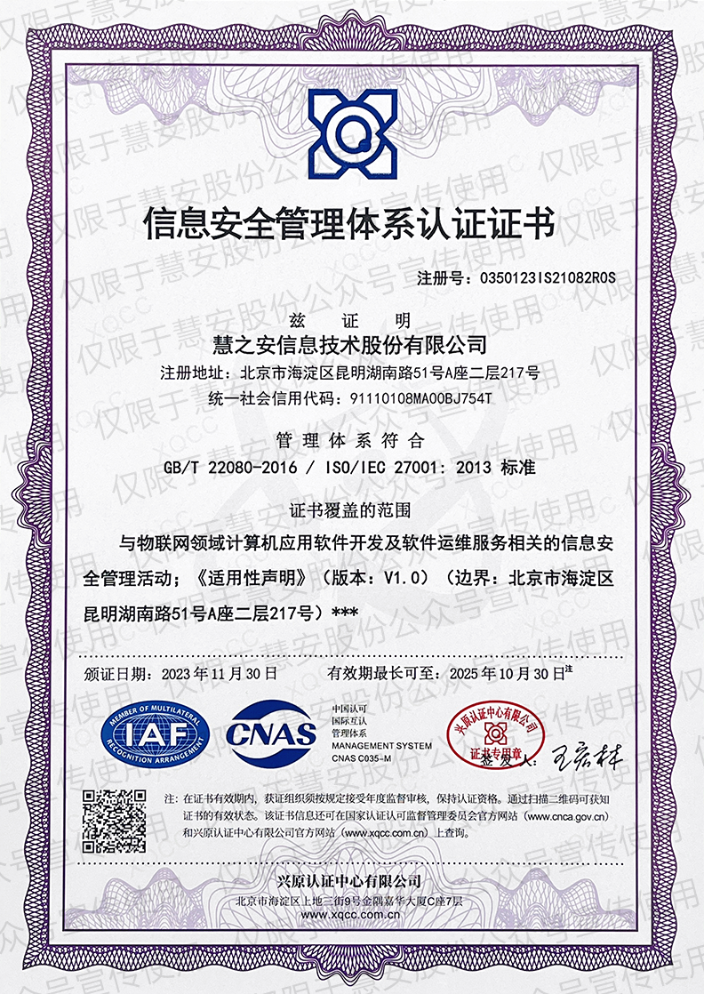 总之,慧之安信息技术股份有限公司成功通过ISO27001认证,标志着公司在信息安全管理和风险控制方面取得了新的进步。我们相信,在未来的发展中,慧之安将继续保持领先地位,为客户提供更加优质的产品和服务!