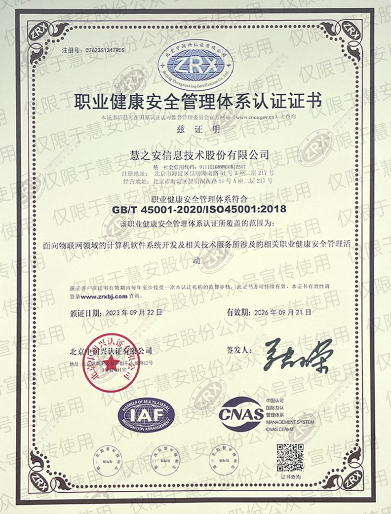 通过ISO45001认证,表明慧安股份已经建立了符合国际标准的职业健康安全管理体系,能够有效地控制和减少职业健康安全风险,提高员工的安全意识和保障员工的安全健康。